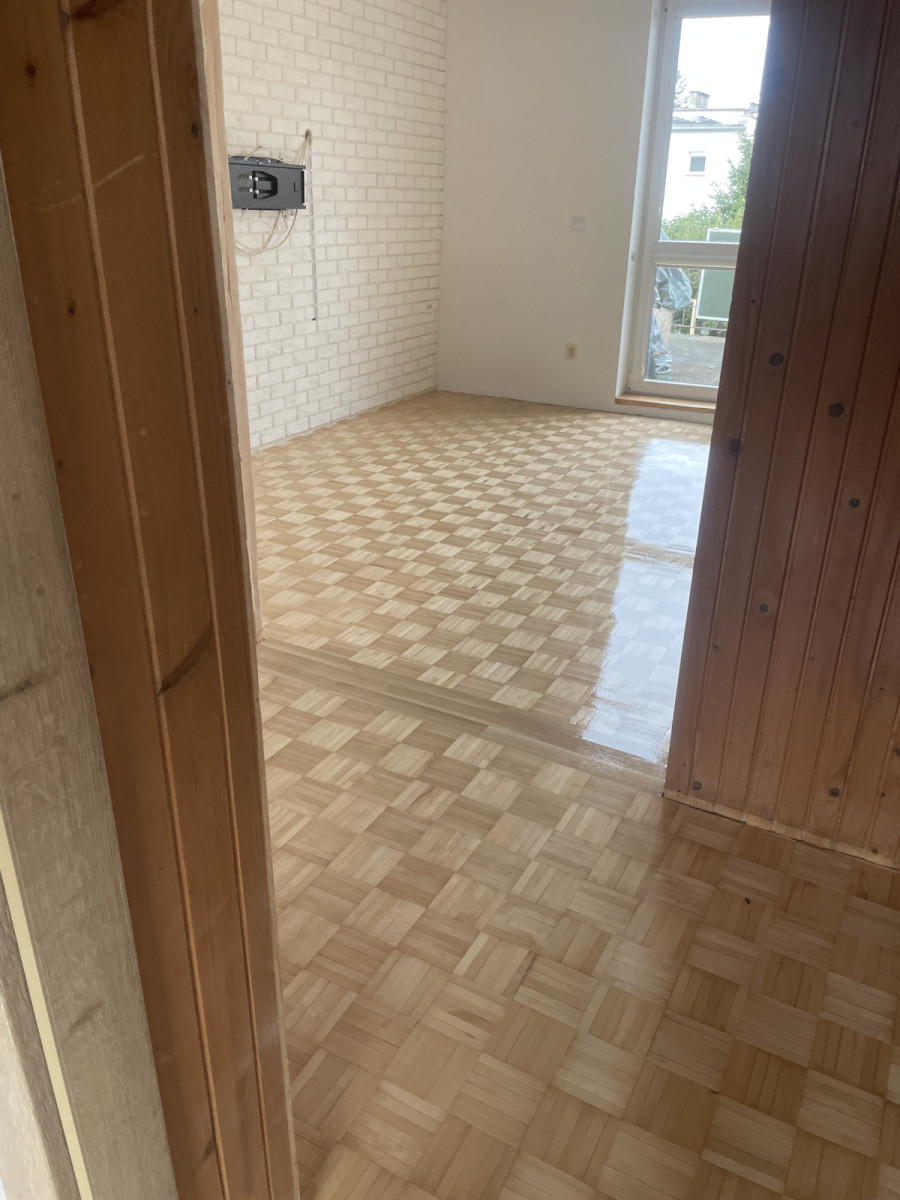- Ostatnim etapem prac było lakierowanie parkietu – 3 warstwy, aby podłoga służyła przez długie lata