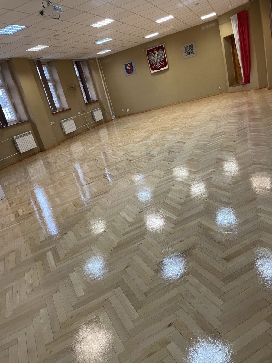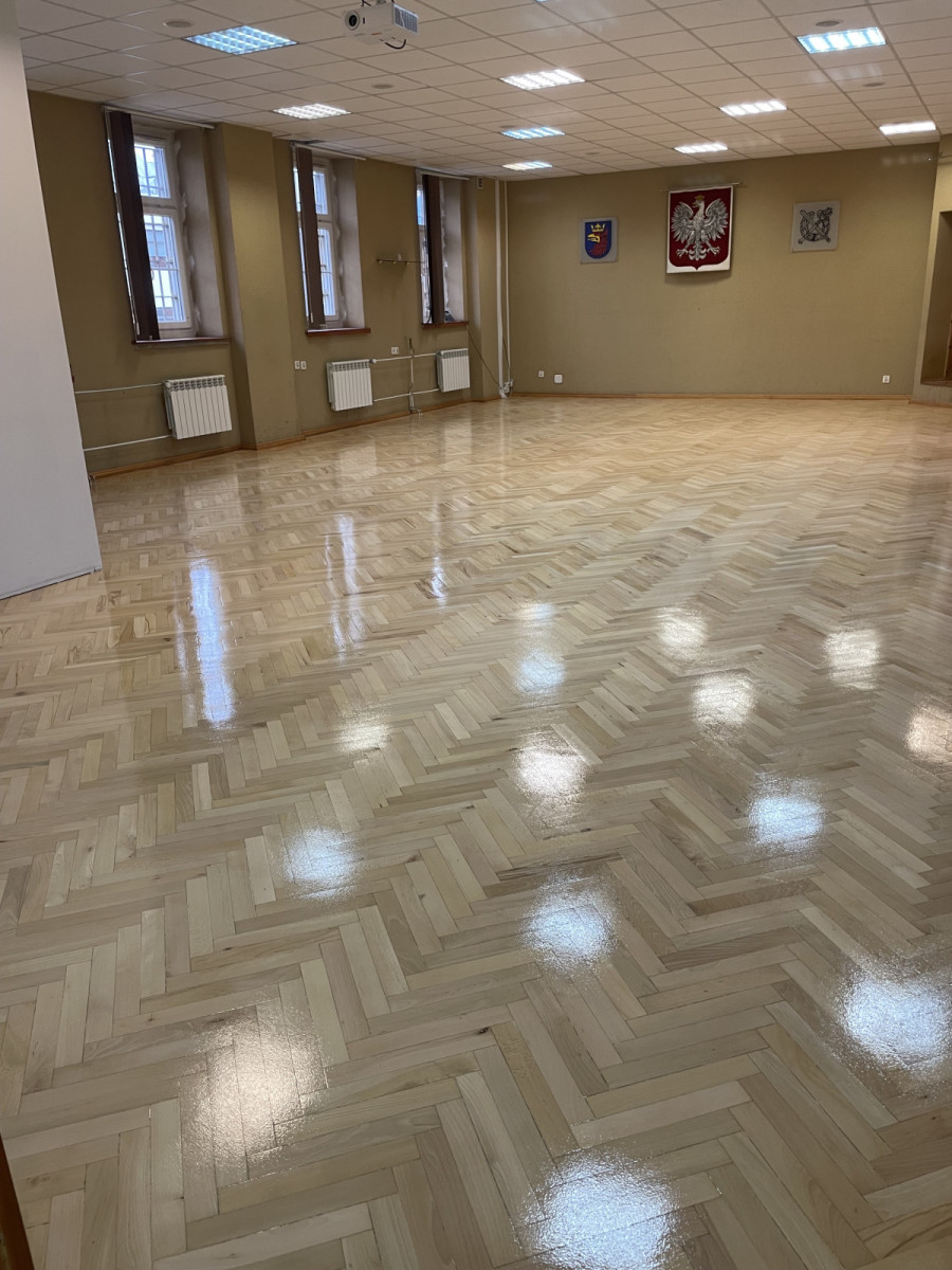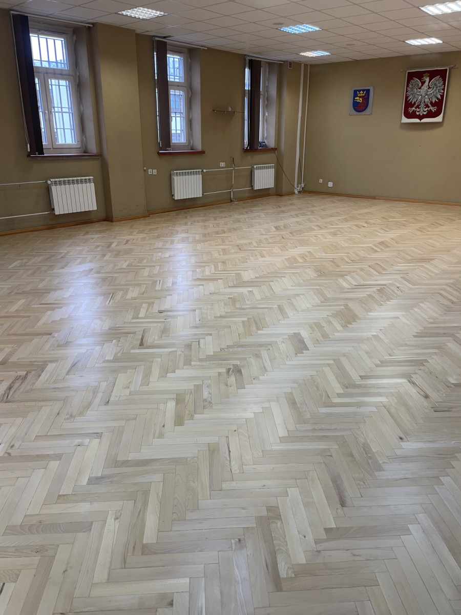 Renowację rozpoczęto od cyklinowania parkietu do surowego drewna, co umożliwiło dokładne wyrównanie i oczyszczenie powierzchni